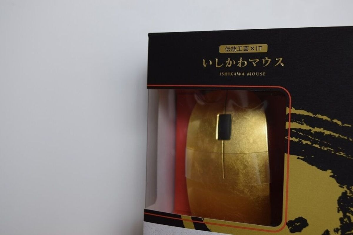 日本の強みをいかす、伝統工芸×ITのマウス。 石川県の伝統工芸をいかしたIT製品を生み出している朝日電機製作所による「金箔マウス」。掌で覆う部分に純度の高い金箔を貼りつけてあり、本物の黄金の輝きを楽しめます。金箔と一言にいっても、その種類は多く、金の配合比率や厚み、製法、原材料等の違いによって、多種多様な箔があります。純金箔はその中で、金の配合率が、94.443%以上のものをさしています。