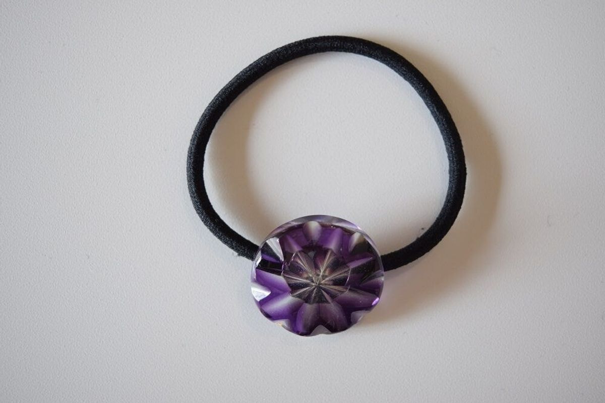 アクセサリー、伝統工芸品、愛用品。 ガラス工房の弟子丸によって作られたECO KIRIのヘアゴムです。 ECO KIRIは器として時を刻むことのなかった硝子廃材たちに、もう一度灯をともすブランドです。薩摩切子の工程上で排出されてきた硝子廃材を切子師の技でアクセサリーとして生まれ変わらせました。不揃いな硝子廃材をベースにするからこそ、同じものは一つとして生まれません。 髪だけでなく腕にもおすすめ。 サイズ:直径約2.5cm 素材:クリ