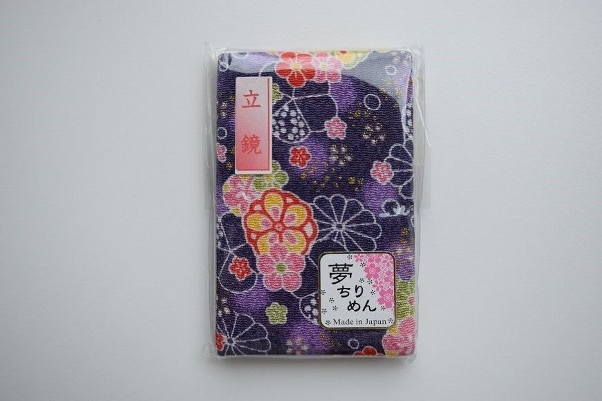 華やかな柄の鏡、どこでも、いつでも。 持ち運びに便利な、ミニスタンドミラーです。 折りたたみ式で、お化粧ポーチやかばんのポケットに入れて持ち歩くのに便利です。立ち鏡なのでお化粧直しにも両手が使えます。ふんわりと綿が入ったやさしい手触り。花や鞠が描かれた、日本らしい古典的な柄です。 サイズ:10x6.5㎝ 素材:生地 レーヨン、鏡 ガラス