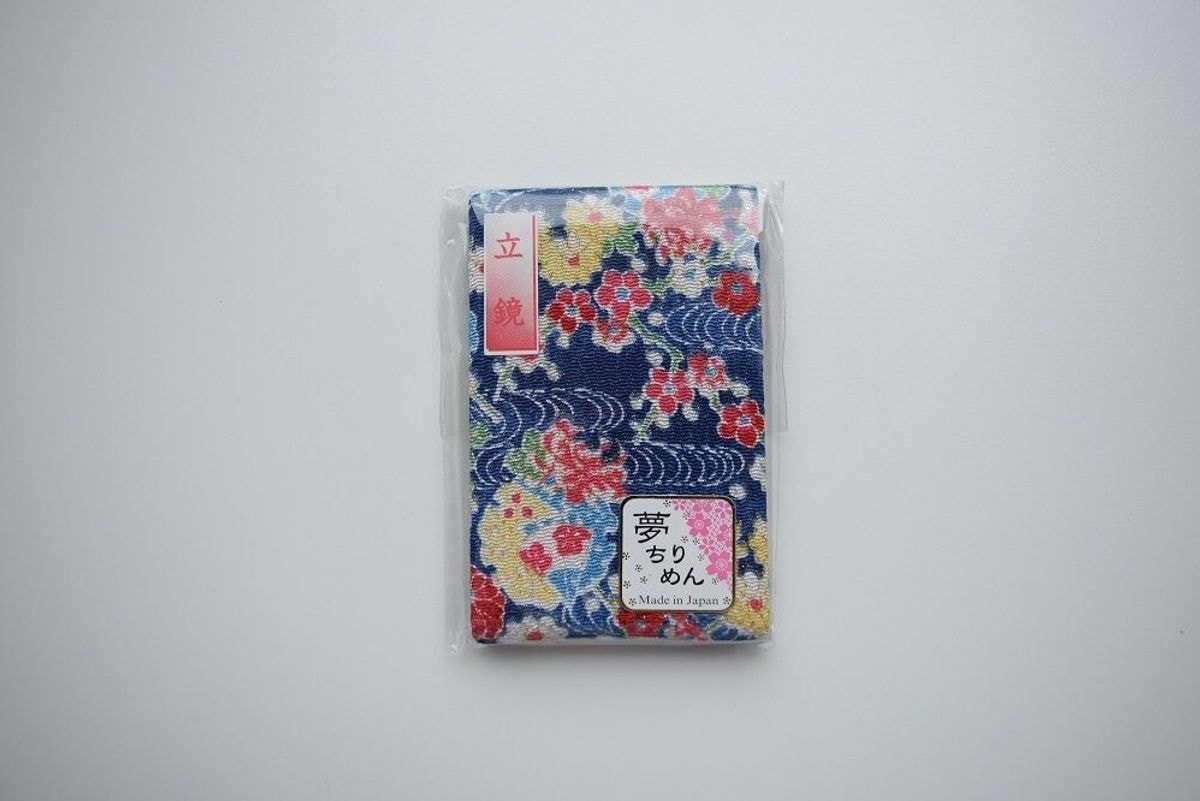 華やかな柄の鏡、どこでも、いつでも。 持ち運びに便利な、ミニスタンドミラーです。 折りたたみ式で、お化粧ポーチやかばんのポケットに入れて持ち歩くのに便利です。立ち鏡なのでお化粧直しにも両手が使えます。ふんわりと綿が入ったやさしい手触り。花や鞠が描かれた、日本らしい古典的な柄です。 サイズ:10x6.5㎝ 素材:生地 レーヨン、鏡 ガラス