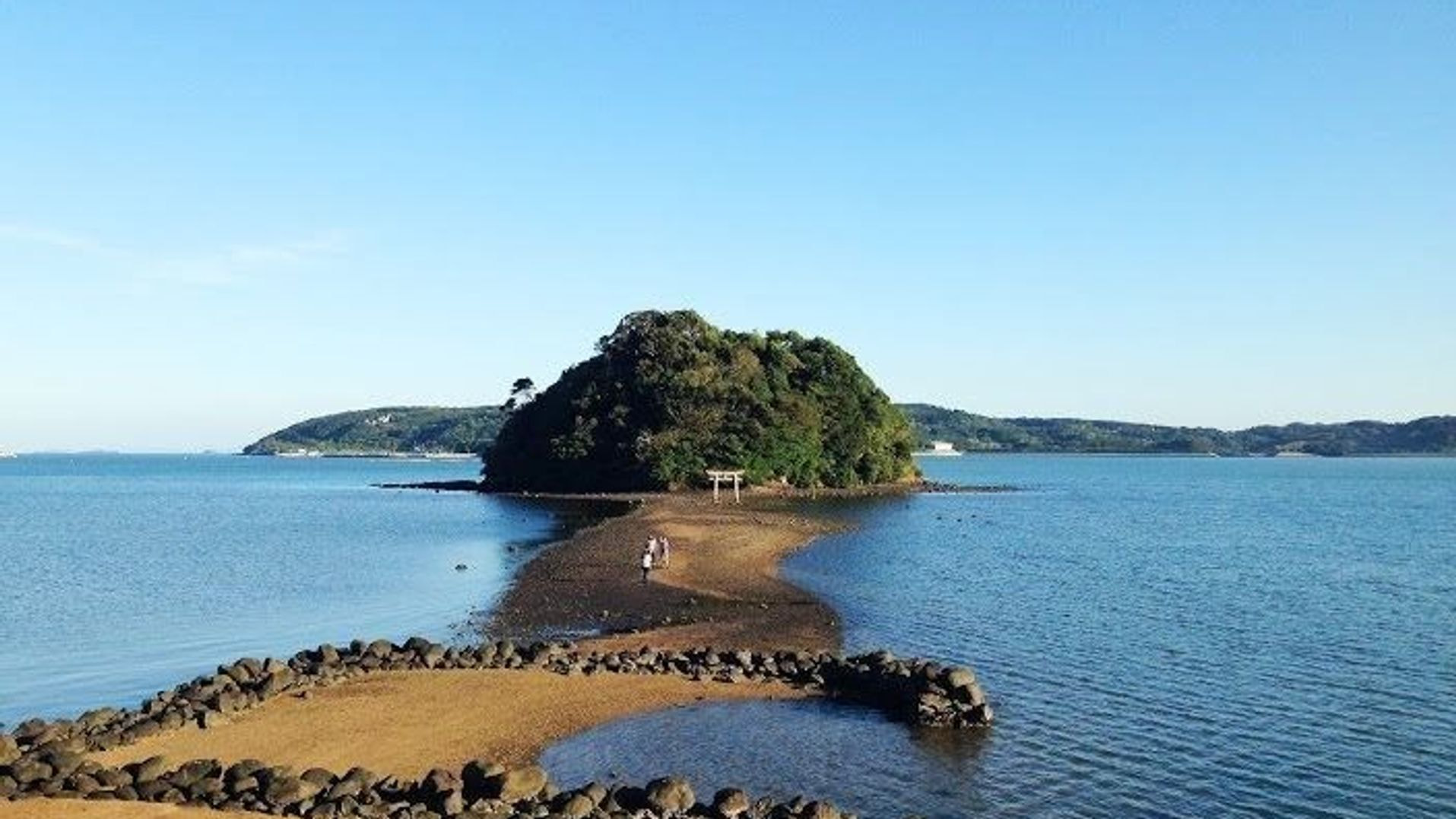 We first rode bikes to Kojima shri...ne. This place is also called “Mont Saint Michelle in Iki”. Because the road to the island appears only when it’s low tide.