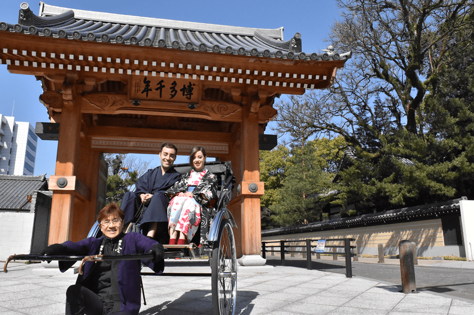 歴史情緒あふれる「旧市街博多」を日本発祥の乗り物「人力車」に乗って散策します。人力車の上から見る博多のにぎやかなビジネス街と、古い町並みの対比はとても特別な気分を味わえます。車夫のオススメスポットで記念撮影もあります!