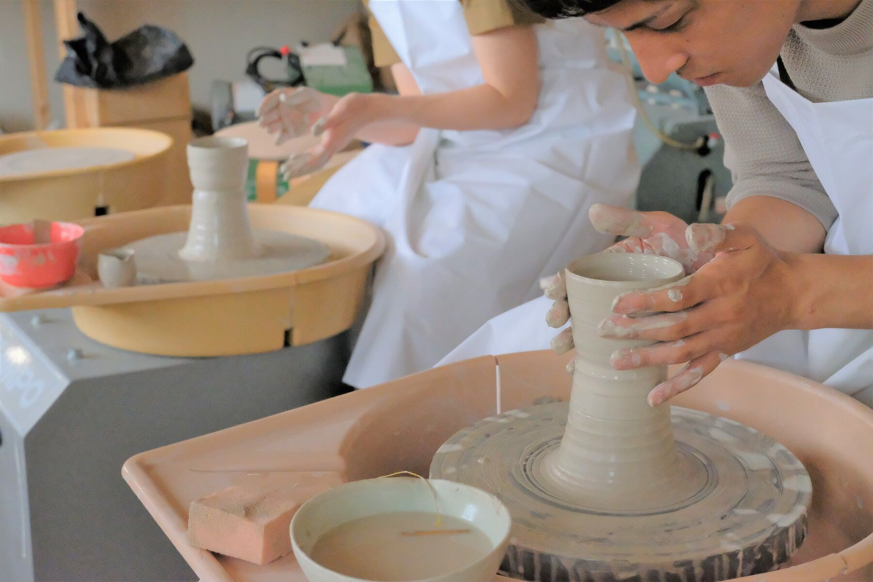 有田焼・伊万里焼などで知られる真っ白に焼きあがる磁器土を使って、ロクロ成形による器づくりの体験です。柔らかい粘土をコントロールするのはとても難しい事で、失敗する事もあります。ですが自身の掌で作り上げた器はきっと特別な食器になるはずです。